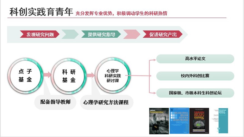 院团委高度重视科创育人,始终坚持将促进专业成长、提升科创能力作为引领青年学生的核心。在科研方面,以“点子基金”为启蒙,搭建零门槛科研平台,激发学生科研兴趣;以科研基金为支持;以“心理学科研实践研讨课”为保障,促进科研产出。在创业方面,打造了“健康+”创业育人平台,逐步建立了赛、创、学三位一体的创新育人模式。
