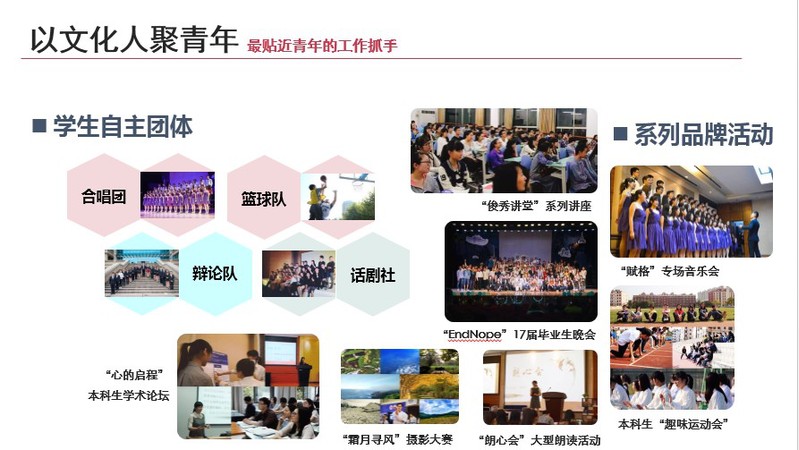院团委坚持发掘并打造特色品牌学生组织,创造出一系列站得住、叫得响、传得开、留得下的精神文化活动与产品。心院团委着重推动学院文体活动的开展。以新生文艺汇演、毕业生晚会、十大歌手为主要阵地,搭建青春活力舞台;以校运会、新莘杯、阳光体育联赛为主体,辅以创新的活动形式,促进锻炼的积极性。学院下设10家学生社团,成为学院学生工作的新的阵地,并发展了一批有影响力的学生社团。