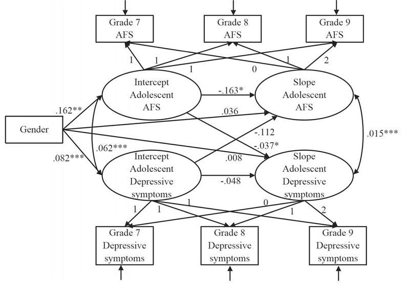 研究对853名7年级学生(51.6%男生,M年龄=14.65岁,SD年龄=0.54岁)进行了为期三年追踪,每一年请青少年报告亲合独处程度和抑郁症状。研究在控制了害羞等因素的影响后,得出以下结果:1)亲合独处和抑郁症状均在7-9年级间均呈现显著增长的趋势。也就是说,中国青少年在7-9年级这一时期越来越倾向于独处,而同一时期青少年的抑郁症状水平也逐渐升高;2)亲合独处的起始水平与抑郁症状的起始水平呈显著正相关,7年级时亲合独处水平更高的青少年报告了更高水平的抑郁症状。亲合独处的增长速度与抑郁症状的增长速度也呈显著正相关,亲合独处上升速度越快,抑郁症状的上身速度也越快;3)亲合独处的起始水平可显著负向预测抑郁症状的增长速度,7年级时亲合独处水平更高的青少年抑郁症状的上升趋势会得到一定的缓解;4)女孩报告了更高水平的亲合独处和抑郁症状,但在二者的发展速度上并不存在显著的差异。