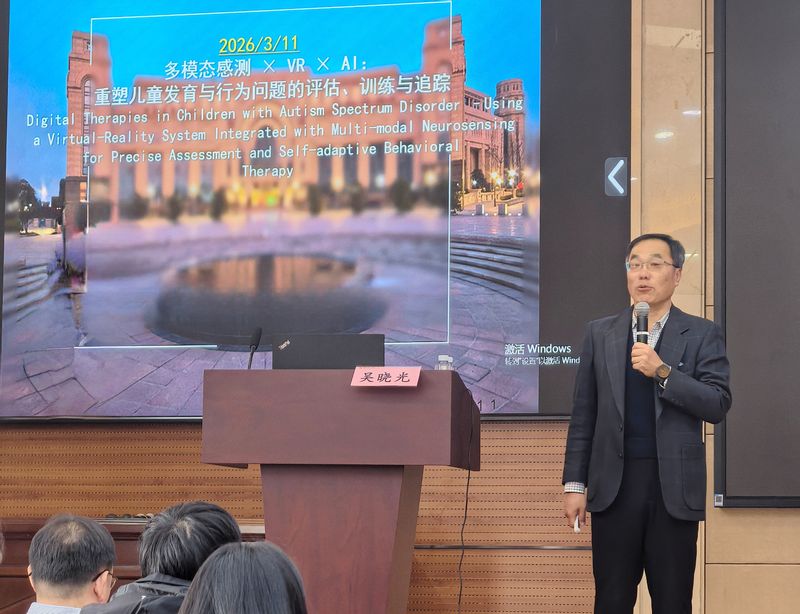 随后,吴晓光教授重点介绍了其团队在“VR+多模态神经行为感测系统”方面取得的一系列创新成果。该系列系统已成功应用于多个实践场景:包括注意缺陷多动障碍儿童的诊断与认知训练、抑郁症患者的辅助评估,以及孤独症谱系障碍儿童的辅助诊断与社交技能训练。吴教授通过生动的案例与数据,展示了该技术如何将虚拟现实、多模态传感与人工智能深度融合,为儿童发育与行为问题的早期识别、干预及长期追踪提供全新解决方案。