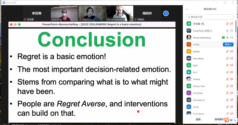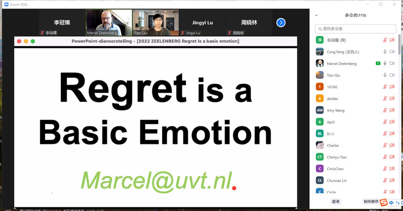 2022年5月24日,应我院邀请,荷兰蒂尔堡大学社会心理学系教授Marcel Zeelenberg通过zoom会议作了题为“Regret is a Basic emotion”的报告。本次报告由陆静怡教授主持,百余名师生参加。