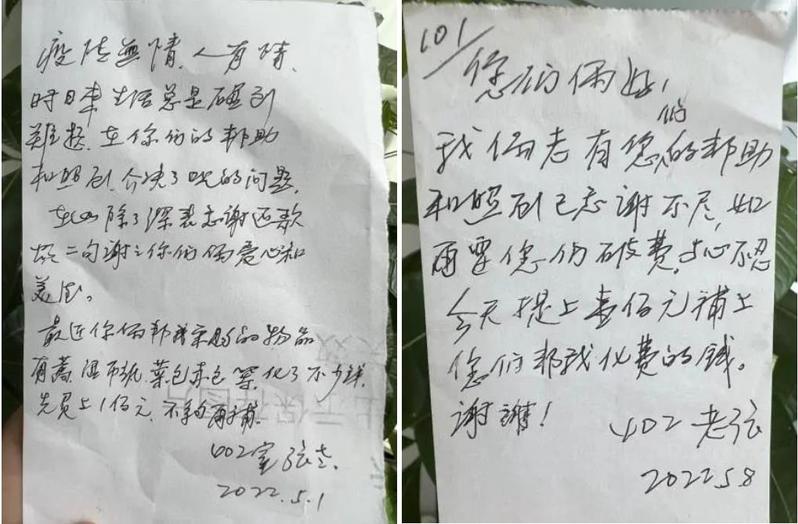 劳动节当天,孟老师和万老师家的门把手上“惊现”一张纸条和一百元现金。原来,它来自于本楼道402室的一对老年夫妇。妻子患有糖尿病,长期瘫痪在床,老先生也已86岁。封控期间,孟老师默默做起了他们的采购员,帮助他们解决了生活困难。老先生不善言辞,就留下了一封感谢信。信中还提到孟老师和万老师采购物资经常帮他们垫付,老人先付一百元,不够再补。两位青年党员收到信的那一刻,觉得非常暖心。他们说:自己只是做了力所能及的事情。