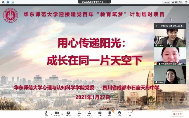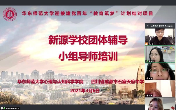 作为华东师范大学迎接建党百年“教育筑梦”计划结对项目“用心传递阳光:成长在同一片天空下”的系列活动之一,4月8日我院团委书记李琳怡带队赴成都开展生命教育团体辅导与“一人一故事”师资培训。