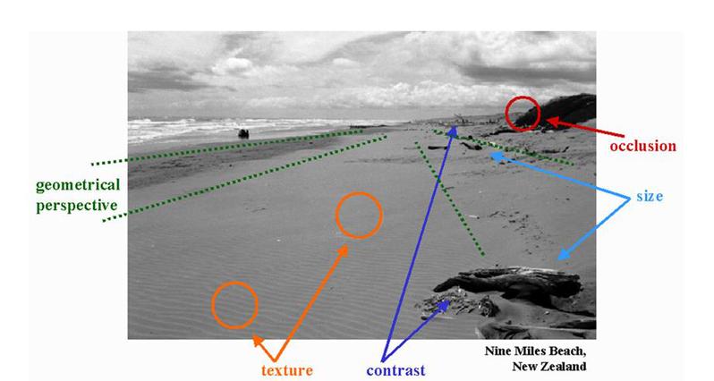 人们可以通过各种线索来识别空间中的深度信息。如上图所示,即使对于2D图像,我们依然可以使用包括透视、纹理梯度变化、遮蔽等一系列线索来评估图像中各个位置的相对深度。然而一个更深入的问题在于,我们是如何使用这些信息的?如果我们真是基于特定的局部线索来完成深度知觉的,那我们的深度知觉就会很大程度上会依赖于特定的环境。在我们熟悉的环境中,我们会更善于找到有效的局部线索,从而帮助我们更好地加工深度信息。然而事实上我们的深度知觉并非十分依赖特定环境——人们在不熟悉的环境中也能基本准确地判断深度信息。所以,是否存在另一种通用的机制,帮助我们用更加一般的规则经行深度知觉加工呢?这一问题一直受到相关领域研究者的关注。