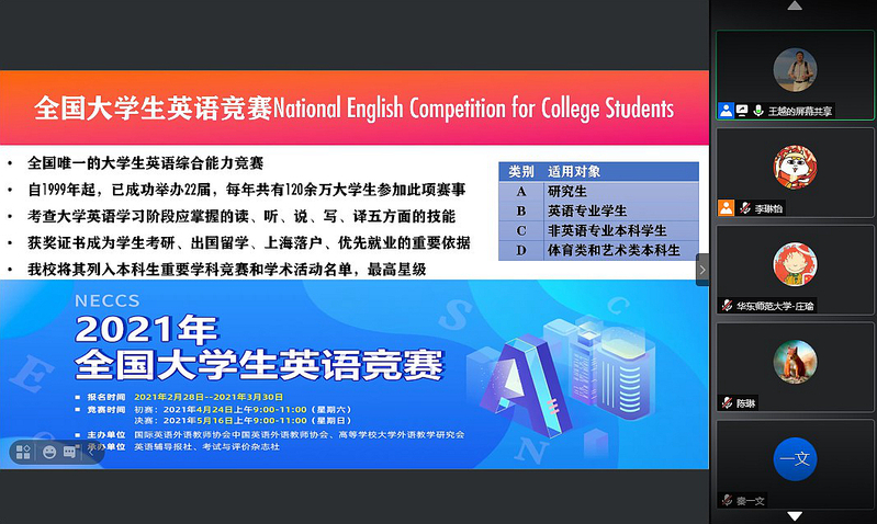 4月14日,心理与认知科学学院举办 “2021年全国大学生英语竞赛辅导线上培训”,邀请校英语学科竞赛中心主任王越为主讲人,我院共102名学生参赛。