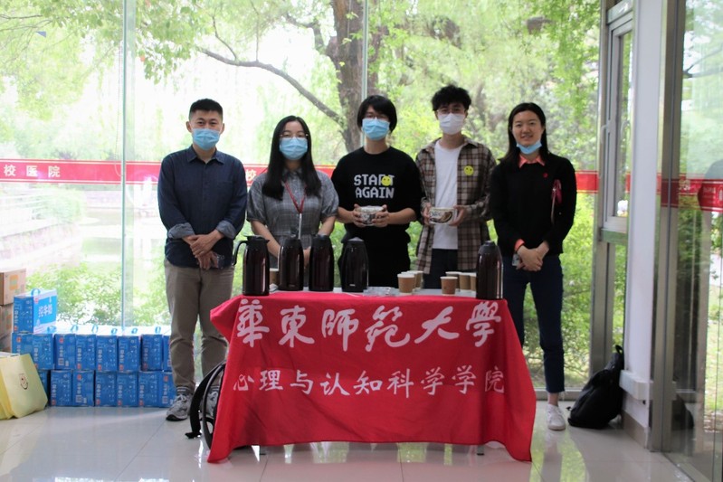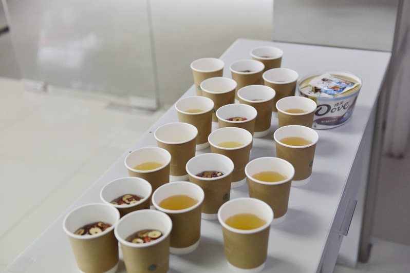董镕、李琳怡、赵菲菲等老师与大三本科生班委担任爱心志愿者一起布置服务台,为献血同学们提供桂圆红枣茶与巧克力,补充能量。