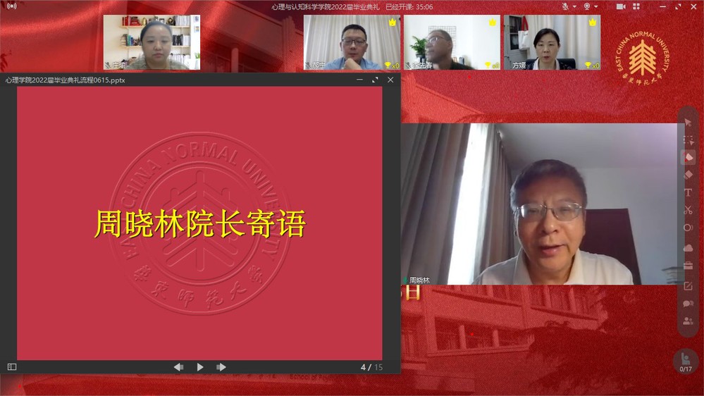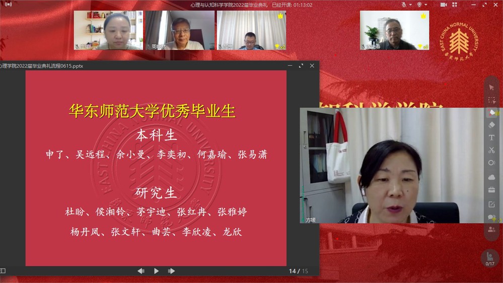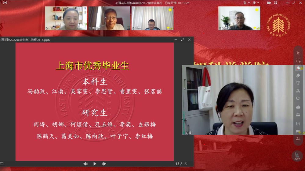 6月15日,心理与认知科学学院2022届线上毕业典礼隆重举行。心理与认知科学学院院长周晓林,院党委书记方媛,副院长郝宁,副院长李先春,部分教师代表及全体毕业班辅导员出席典礼,共同见证这一重要时刻。典礼由院党委副书记兼副院长庄瑜主持。