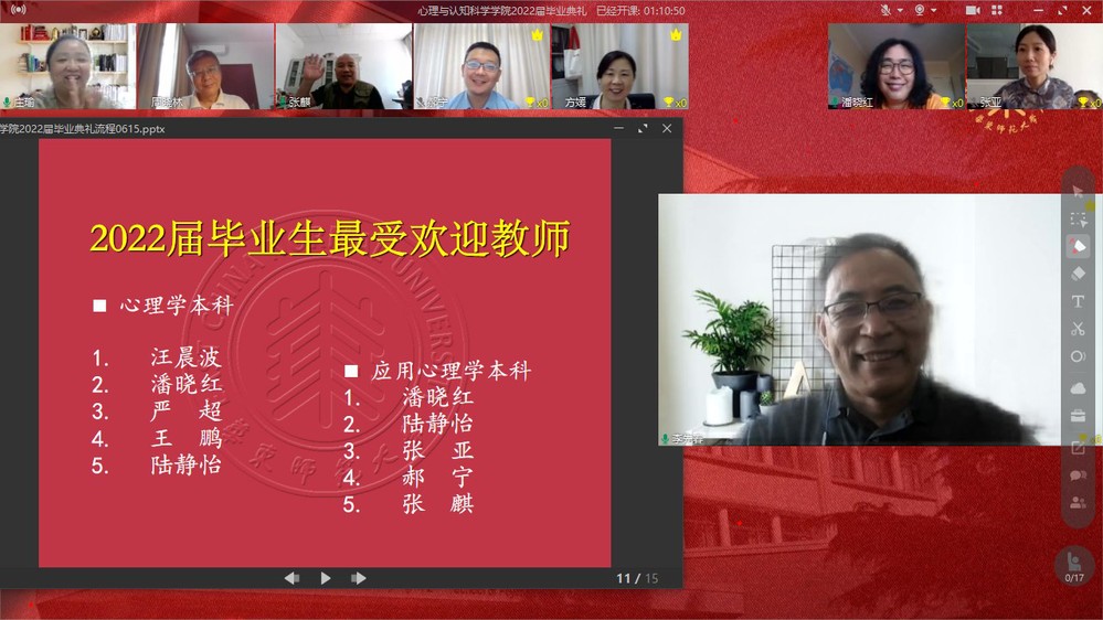 每年,学校教务处在本科应届毕业生中都会开展 “本科毕业生问卷调查——评选你心目中最优秀教师”的活动,经过统计,我院共有8位教师脱颖而出。他们是汪晨波、潘晓红、严超、王鹏、陆静怡、张亚、郝宁、张麒。副院长李先春老师宣读了名单,“心目中最优秀教师”们也开启摄像头给予同学们毕业祝福。