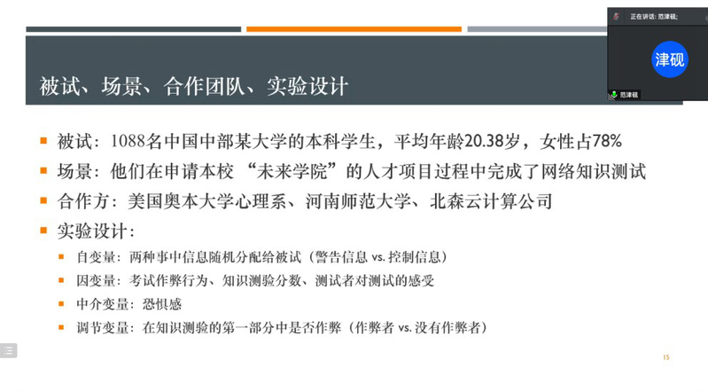 2022年6月24日上午,我院通过线上方式举办俊秀青年学术俱乐部系列讲座,特邀杰出校友,美国奥本大学心理系范津砚教授作题为“事中警告对降低网络考试作弊行为的效应和机制:一个现场实验研究”的学生报告。报告由段锦云教授主持,孟慧教授及相关领域的青年教师、研究生70余人参加了本次报告会。