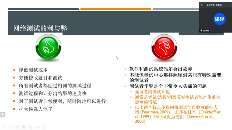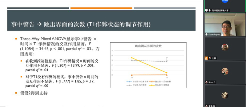 范津砚教授在报告中指出,网络测试因其低成本、使用方便和易标准化等优点得到广泛应用。但同时也带来许多新的问题,比如作弊行为的增加等。范津砚教授及其团队着眼于如何减少网络测试中的作弊行为,探究了事中警告对降低作弊行为的效应和机制。通过现场随机分组实验,范津砚教授及其团队研究发现,事中警告能够通过增加受测者的恐惧感有效地减少作弊行为,并且该效应会受到参与是是否是作弊者/非作弊者的调节。同时,事中警告不会带给受测者测试经历带来负面的影响。研究结果具有重要的理论和实践意义,为网络测试的有公平性提供解决方案。