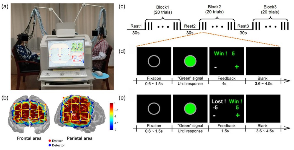 近期,李先春与汪晨波课题组合作在Human Brain Mapping上在线发表最新研究成果,揭示了女性被试中疼痛促进合作行为的同步活动脑机制。研究招募了66名女大学生被试,32人涂抹辣椒素引发疼痛感受,34人涂抹护手霜作为对照。采用近红外成像技术(fNIRS)记录脑活动(图1a&b),被试先后完成三轮合作按键任务(图1c);数据分析时,计算脑间活动同步性等指标。
