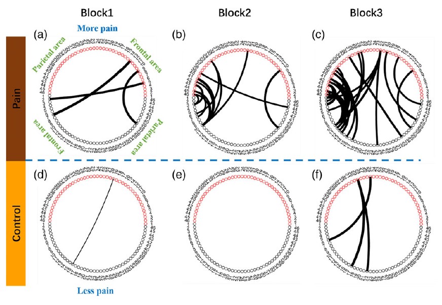 近红外成像结果显示,在第二轮合作任务中,疼痛组左侧额叶的脑间活动同步性增强(图3b&m),这可能与被试有目的的增加协调行为的认知控制有关;在第三轮合作任务中,疼痛组右侧顶叶的脑间活动同步性增强(图3i&o),这可能与被试对他人合作行为的心理表征有关。此外,疼痛被试的额顶网络间的同步性连接随时间不断增强(图4)。