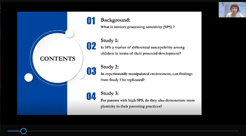 晏妮副教授的报告围绕“感觉加工敏感性”展开。感觉加工敏感性(Sensory Processing Sensitivity,SPS)指个体中央神经系统的敏感性,代表了对物理环境、社会、情绪刺激的深层次认知加工程度。感觉加工敏感性较高的个体从一开始便能更容易关注到环境中的刺激,进而对这些信息进行更深层次、更复杂层面的加工。由于他们对刺激加工过程更加彻底,因此他们的发展可能也更容易受到积极与消极环境的影响,也就是对环境有更高的“易感性”。晏妮副教授介绍了感觉加工敏感性的定义、测量工具和研究现状,并着重讲解了其课题组如何通过纵向追踪、实验室行为实验和日记研究,来探索感觉加工敏感性在婚姻系统和亲子互动系统中所起的调节作为。这些研究为进一步理解感觉加工敏感性特质及其作用机制奠定了理论基础,并对在家庭养育和教育实践中制定有效的干预项目提供了重要指示。