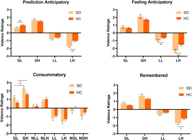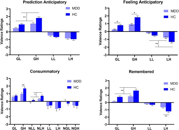 (注:四个图表表示MDD组及其对照组在收益,损失,无收益和无损失条件下的预期,即时和回忆的情绪反应的价态评级。GL/GH:收益条件下的低/高情绪反应性;NGL/NGH:无收益条件下的低/高情绪反应性;LL/LH:损失条件下的低/高情绪反应性;NLL/NLH:无损失条件下的低/高情绪反应)