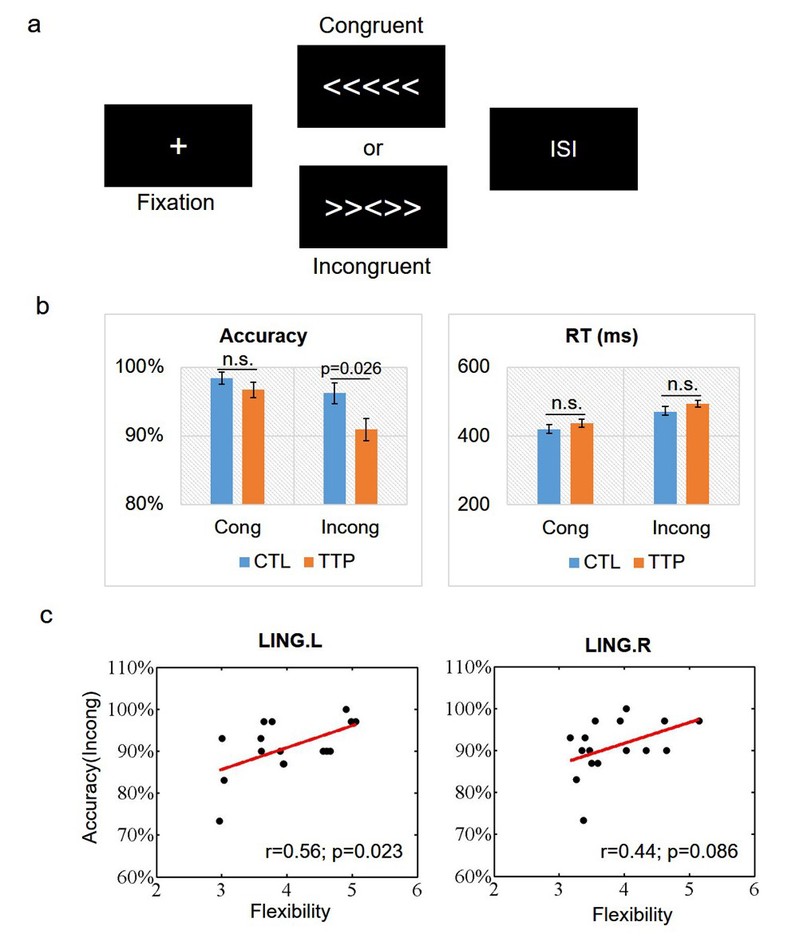 图5:(a)Flanker任务范式;(b)行为学指标的统计结果;(c)乒乓球运动员处理不一致条件Flanker刺激的准确率与视觉皮层内在功能灵活性之间的相关性。