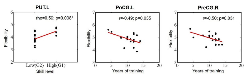 通过静息态功能磁共振成像和动态脑网络分析,发现乒乓球运动员感觉运动区(即右侧中央前回,左侧中央后回,右侧顶上小叶和左侧壳核)的内在功能灵活性增加,而视觉区(即两侧舌回)的内在功能特异性增加(功能灵活性减小)(图2)。从动态功能连接的概率分布来看,感觉运动区与广泛分布的额顶脑区之间的连接概率增加,而与感觉运动系统内脑区之间的连接概率减小。相反,两侧舌回与初级视觉区之间的连接概率增加,而与广泛分布的额顶脑区之间的连接概率减小(图3)。通过相关分析发现,乒乓球运动员左侧壳核的内在功能灵活性与运动技能水平呈正相关;左侧中央后回和右侧中央前回的内在功能灵活性与训练年限呈负相关(图4);而视觉区的内在功能灵活性与技能水平和训练年限都不相关。该结果表明了乒乓球运动员的技能水平与基底节中的重要运动核团—壳核的神经灵活性有关。