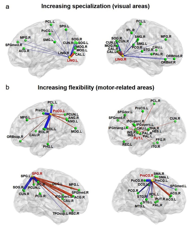 图3:乒乓球运动员视觉-运动区(黄色小球)动态连接概率的变化。红色线条表示运动员连接概率增加,蓝色线条表示连接概率减小,线宽反映变化的大小且红色和蓝色线条的总宽度相等。