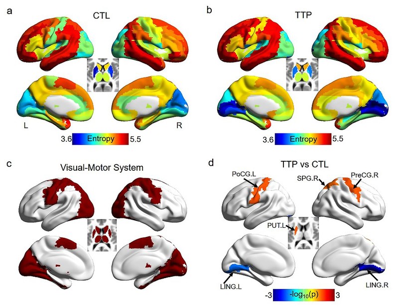 图2:(a,b)对照组与乒乓球运动员大脑内在功能灵活性图谱;(c)视觉-运动系统感兴趣区;(d)乒乓球运动员(TTP)与对照组(CTL)之间内在功能灵活性存在显著差异的脑区。