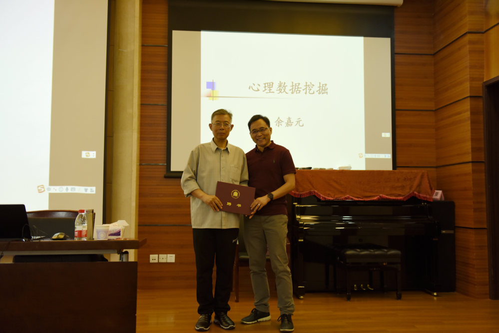 聘任仪式后,余嘉元教授为师生开启了《心理数据挖掘》课程。余嘉元教授的讲课深入浅出,幽默诙谐。他先以最近亲历的无锡工厂的调研和科技攻关为例向广大师生介绍了心理数据挖掘的问题关键点和极大应用价值。接着,余嘉元教授结合大量通俗易懂的实例讲解了心理数据挖掘所需的基础知识。然后,他向大家详细讲述了数据挖掘的过程,并演示运用MATLAB软件进行分析的步骤。