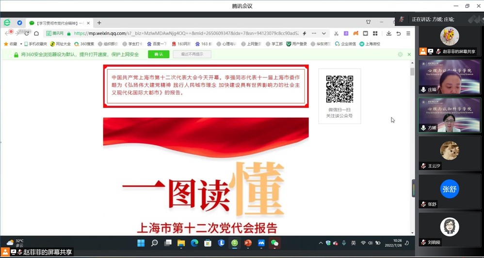 最后,由心理与认知科学学院党委副书记庄瑜领学,师生党员共同学习了中国共产党上海市第十二次代表大会上李强同志题为《弘扬伟大建党精神 践行人民城市理念 加快建设具有世界影响力的社会主义现代化国际大都市》的报告。大家认真学习了“牢记嘱托、砥砺奋进的五年”“加快建设具有世界影响力的社会主义现代化国际大都市”“奋力开创各项事业发展新局面”“以伟大建党精神引领新时代党的建设新的伟大工程”等方面的报告内容,深刻领会了报告精神,不仅感受到近五年上海所取得的辉煌成就,也明确了今后的奋斗方向。与会党员纷纷表示,要认真学习贯彻会议精神,践行人民城市发展理念,为早日建成具有世界影响力的社会主义现代化国际大都市贡献力量。