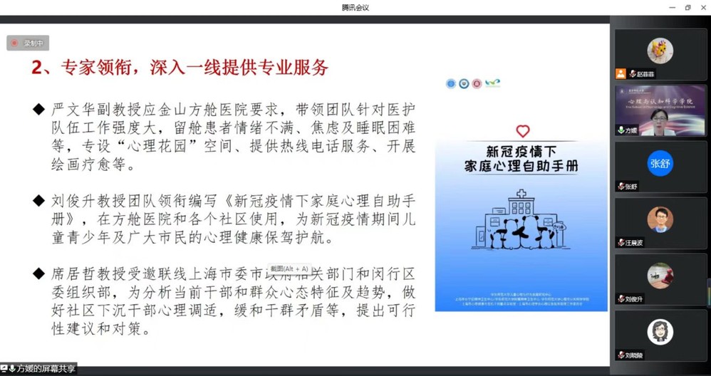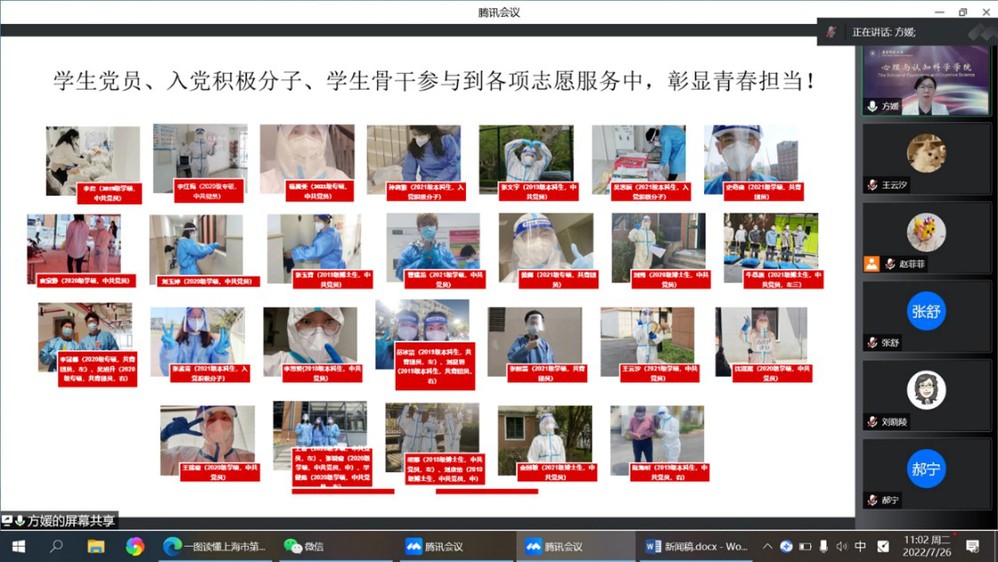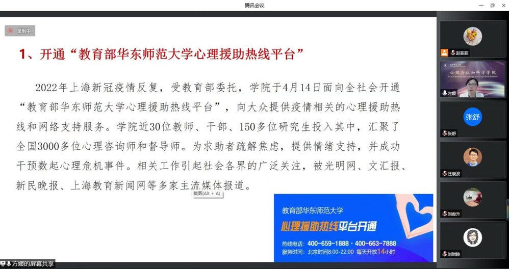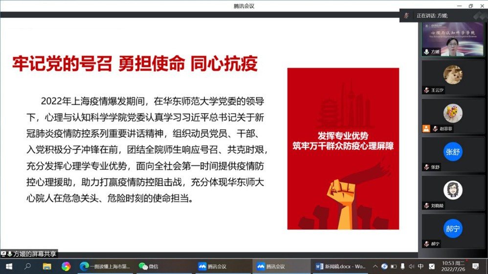 接着,方媛书记联系实际,对2022年上海疫情期间学院的抗疫工作进行了回顾和总结。学院党委认真学习习近平总书记关于新冠肺炎疫情防控系列重要讲话精神,组织动员党员、干部、入党积极分子冲锋在前,团结全院师生响应党的号召、共克时艰,践行使命担当。受教育部委托,学院于4月14日面向全社会开通“教育部华东师范大学心理援助热线平台”,向大众提供疫情相关的心理援助热线和网络支持服务。热线中累计挽救150例心理危机者,解决近500例大中小学生的心理问题,处理1000多例家庭关系问题。智能服务平台的访问总数也达32915人次,切实为疫情中的公众提供了及时的帮助。学院党员教师严文华、刘俊升、席居哲等多位专家领衔,深入一线提供了手册编写、绘画疗愈、对策分析等专业服务。此外,上海市心理健康与危机干预重点实验室领衔推出了3期疫情防控时期心理健康教育网络公益课堂。学院通过直播讲座、微信公众号、Psy Echo电台等多个平台向公众科普疫情防控心理学知识。学院党政领导班子深入一线,带领师生共同守护校园。全院共计75名师生党员服务在抗疫一线,为抗疫做出了切实的贡献。