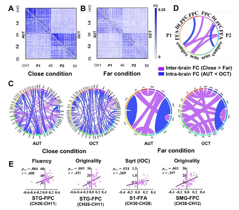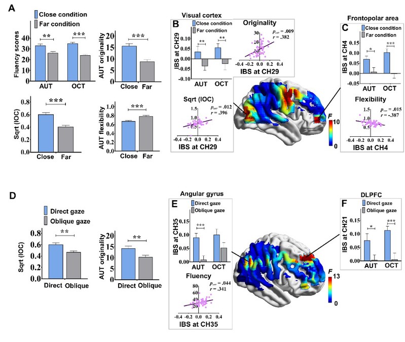 近日,华东师范大学心理与认知科学学院郝宁教授团队采用基于近红外功能成像的超扫描技术,探索了空间距离、注视角度等非言语要素对创造性交流的影响及效应背后的脑间神经互动机制。研究包括两个实验。实验一中,108被试组成54个两人小队,随机分入远距离组与近距离组,每组各27队。实验二中,110被试组成55个两人小队,随机分入直视组与侧视组,直视组27队,侧视组28队。每组被试均需通过言语交流完成创造性观念生成任务(非常规用途任务)与作为对照任务的记忆提取任务(物体特征任务)。实验过程中,使用近红外功能成像设备同时记录两名被试前额叶与右侧颞顶联合区的脑活动水平。通过比较远/近距离组,及直视/侧视组在行为表现、脑间神经耦合水平(IBS)和多脑网络参数上的差异,探索空间距离与注视角度对创造性交流效果的影响及其背后的脑间神经互动机制。