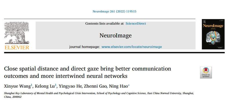 Wang, X.#, Lu, K.#, He, Y., Gao, Z., & Hao, N. * (2022). Close spatial distance and direct gaze bring better communication outcomes and more intertwined neural networks. NeuroImage, 261:119515.