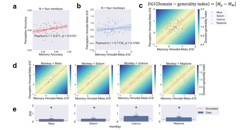图3. 猕猴显示了元认知的领域特异性。知觉和记忆领域的任务表现(决策正确率)呈现相关性(a)。两领域的元认知效率则没有相关性(b)。领域特异性指标(DGI)量化了他们在每个领域的元认知效率得分之间的相似性。DGI分数越高,表明跨领域的元认知相似性越低。较暗的颜色表示跨域的元认知普遍性较低,红色区域表示模拟的DGI值。热力图中显示了四只猕猴(c)和每只猕猴(d)的每日的领域相似性指标(DGI)。每只猕猴的元认知领域特异性均高于随机水平(e)。