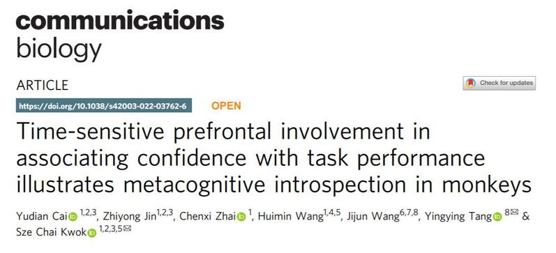 Cai,Y., Jin, Z., Zhai, C., Wang, H., Wang, J., Tang,Y.*, Kwok, S.C*.(2022).Time-sensitive prefrontal involvement in associating confidence with task performance illustrates metacognitive introspection in monkeys. Communications Biology. 5, 799 (2022). doi:10.1038/s42003-022-03762-6.