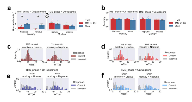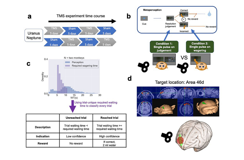 大量在人类被试上进行的研究认为前额叶支持了元认知的表达,而元认知在猕猴脑中如何被处理却鲜有研究。本研究的TMS实验中,研究人员通过在决策前或决策后向背外侧前额叶46d施加单脉冲经颅磁刺激,揭示了前额叶在猕猴元认知计算中所扮演的角色。TMS实验结果发现,在决策前的单脉冲会导致猕猴元知觉的能力受损(图2a),但不会导致知觉的能力的变化(图2b),而决策后的单脉冲不会对元认知及认知能力产生影响。类似结果同样在等待时间的分布上得到验证(图2c-f)。这些结果可以证明在猕猴上,也存在有高度时间敏感性的元认知计算。