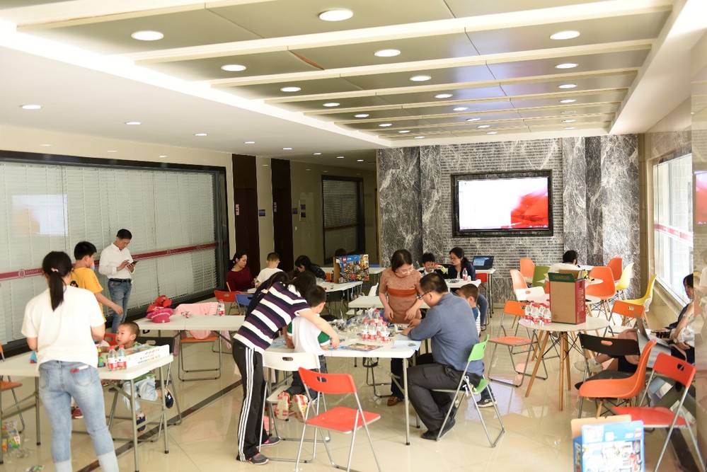 学院工会为参加活动的小朋友们准备了两套大型乐高积木和一些小型乐高积木。大一些的小朋友分成两组,合作完成大型乐高积木的搭建,小一些的小朋友,根据自己的喜好选择小型乐高积木搭建,学生志愿者们给小朋友们作现场指导。孩子们积极开动脑筋,有的选择搭建房间、有的搭建小汽车、有的搭建房子,大家一起合作完成乐高积木的搭建。家长们也陪着孩子们一起亲子互动,其乐融融。