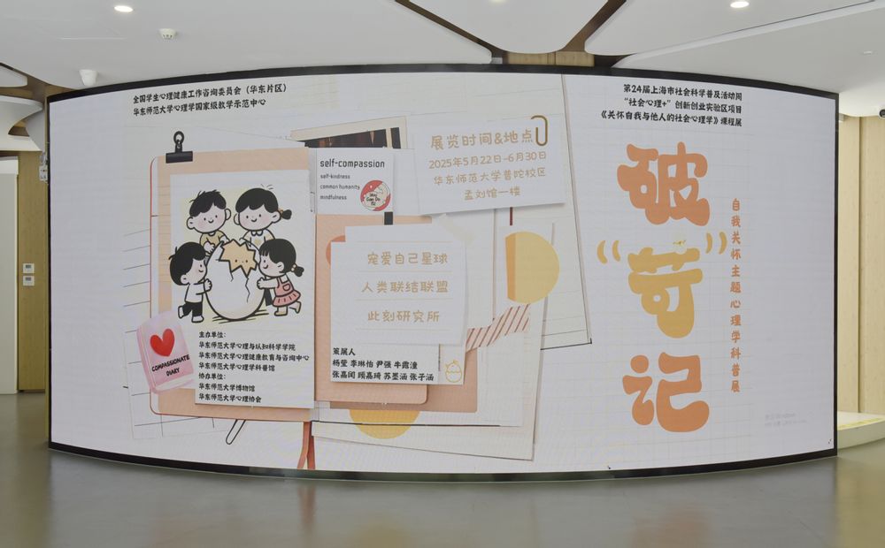 本次科普展是杨莹副教授领衔开设的《关怀自我与他人的社会心理学》通识课程的展示,并入选了第24届上海市社会科学普及周系列活动。展览分为“自我关怀:走出苛责的怪圈”、“宠爱自己星球”、“人类联结联盟”以及“此刻研究所”四个部分,引导青少年及公众打破“自我苛责”的思维怪圈,学会以善意与科学的方式接纳自我、调节情绪、建立积极的心理韧性,并提供自我关怀实践的可行清单。