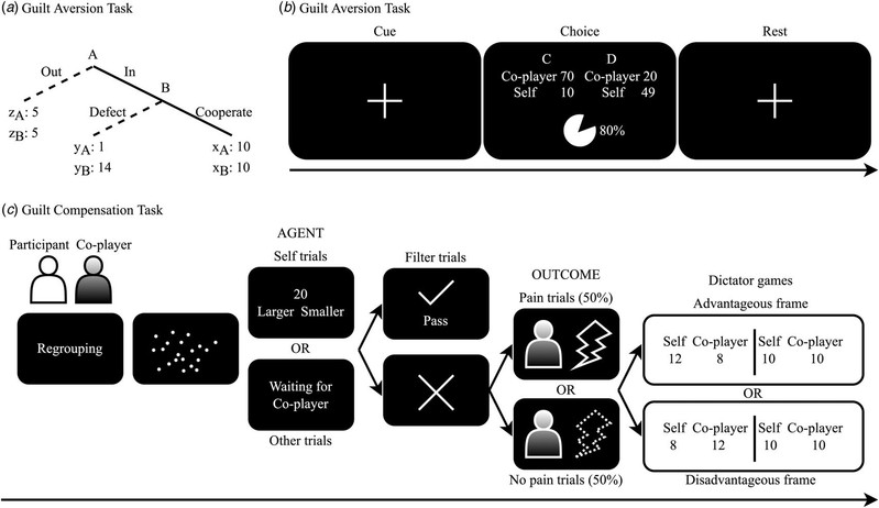 图1. 人际互动范式流程图。(a)基于信任游戏的内疚厌恶任务收益矩阵示例;(b)基于信任游戏的内疚厌恶任务流程图;(c)内疚-补偿任务流程图。