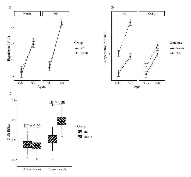 图3. 内疚-补偿结果。(a)OCPD群体主观报告的内疚情绪体验与正常组不存在显著差异;(b)相比于正常组,OCPD群体验到内疚后的补偿行为较少;(c)相比于正常组,OCPD群体体验到内疚后对劣势不公平厌恶的抑制能力较弱。