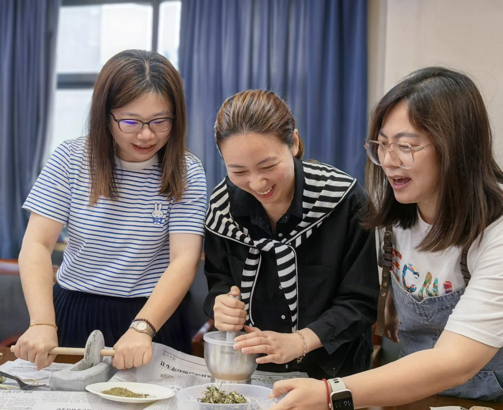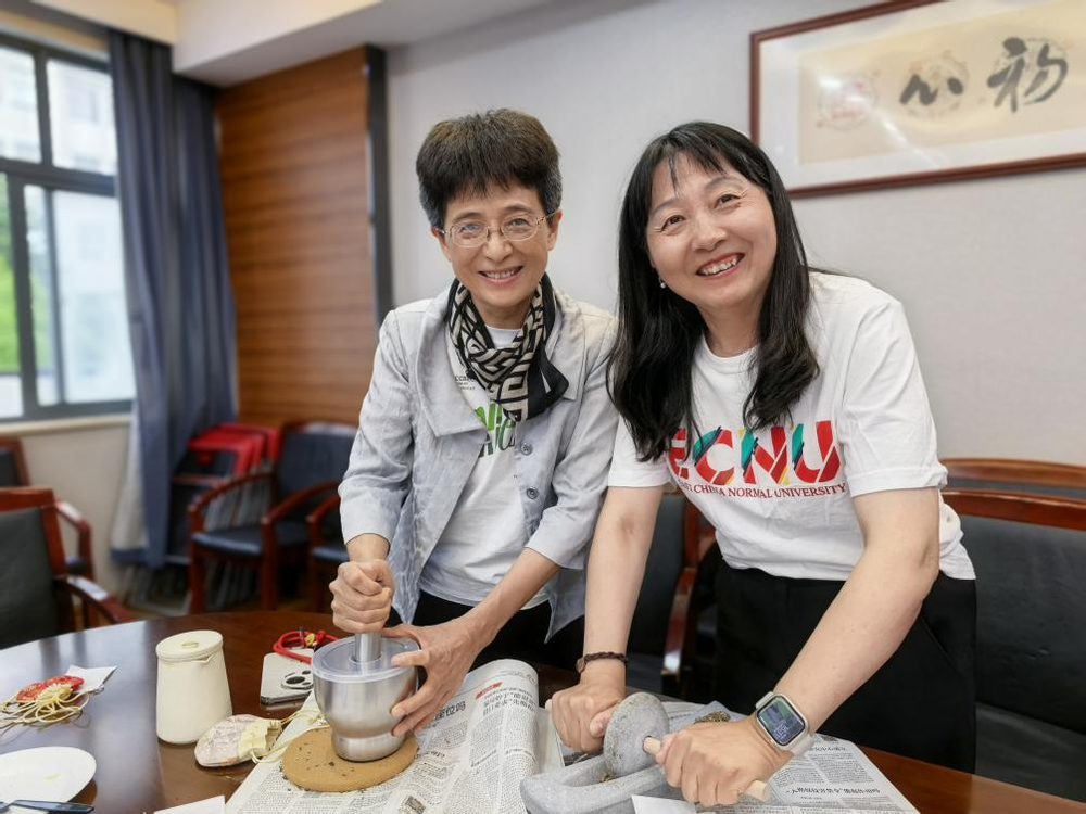 活动伊始,华东师范大学非物质文化遗产传承与应用研究中心研究员刘艳介绍了古法香囊的起源、类型、香料的类型和功效,之后老师们观察和体味了艾叶、藿香、丁香、紫苏叶、细辛、薄荷等14味香料,并依次将它们舂和捻成了粉末,再将香料一点点装入布袋,再制成一个个精美的香囊。老师们相互交流制作心得,分享经验,欢声笑语回荡在活动现场。