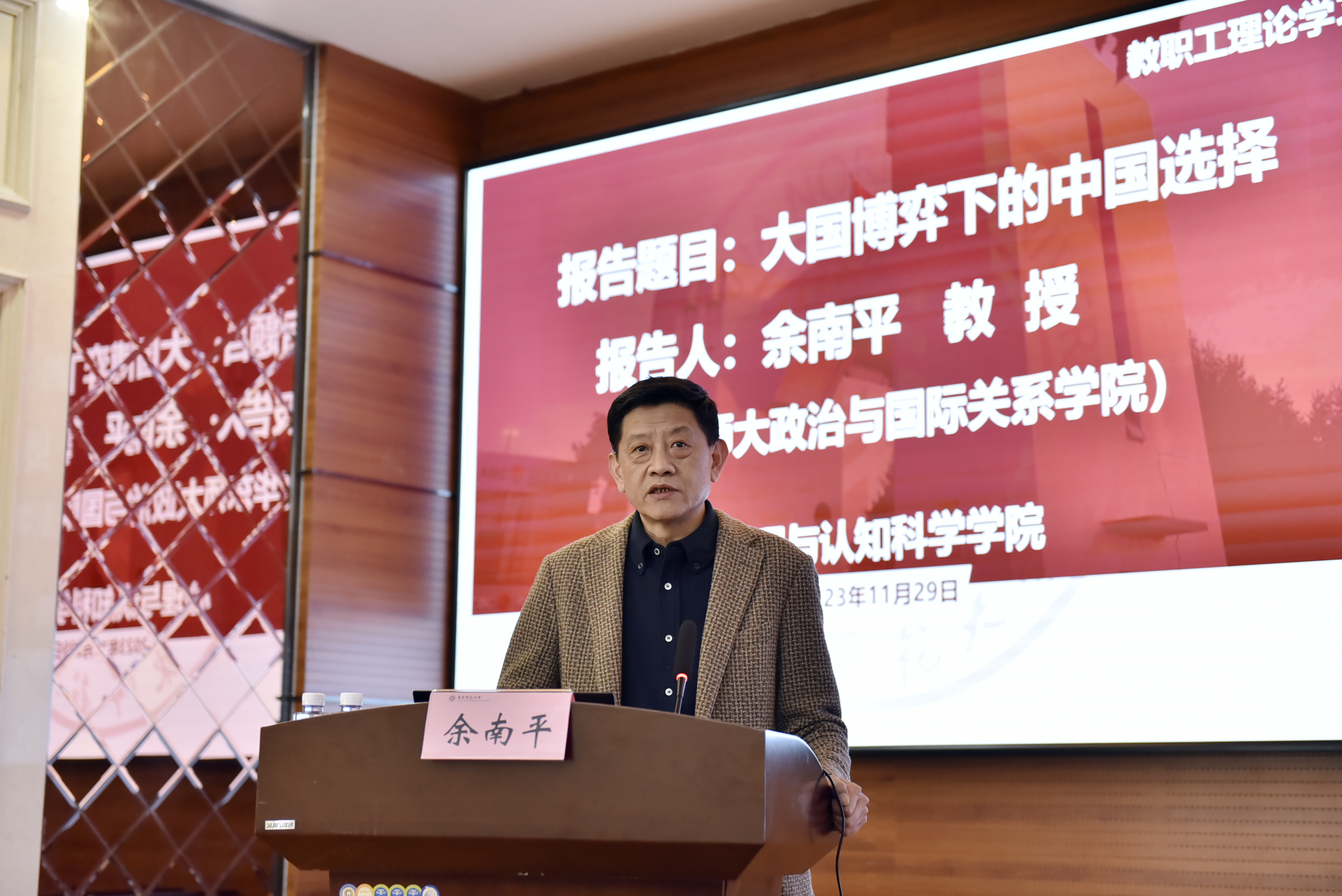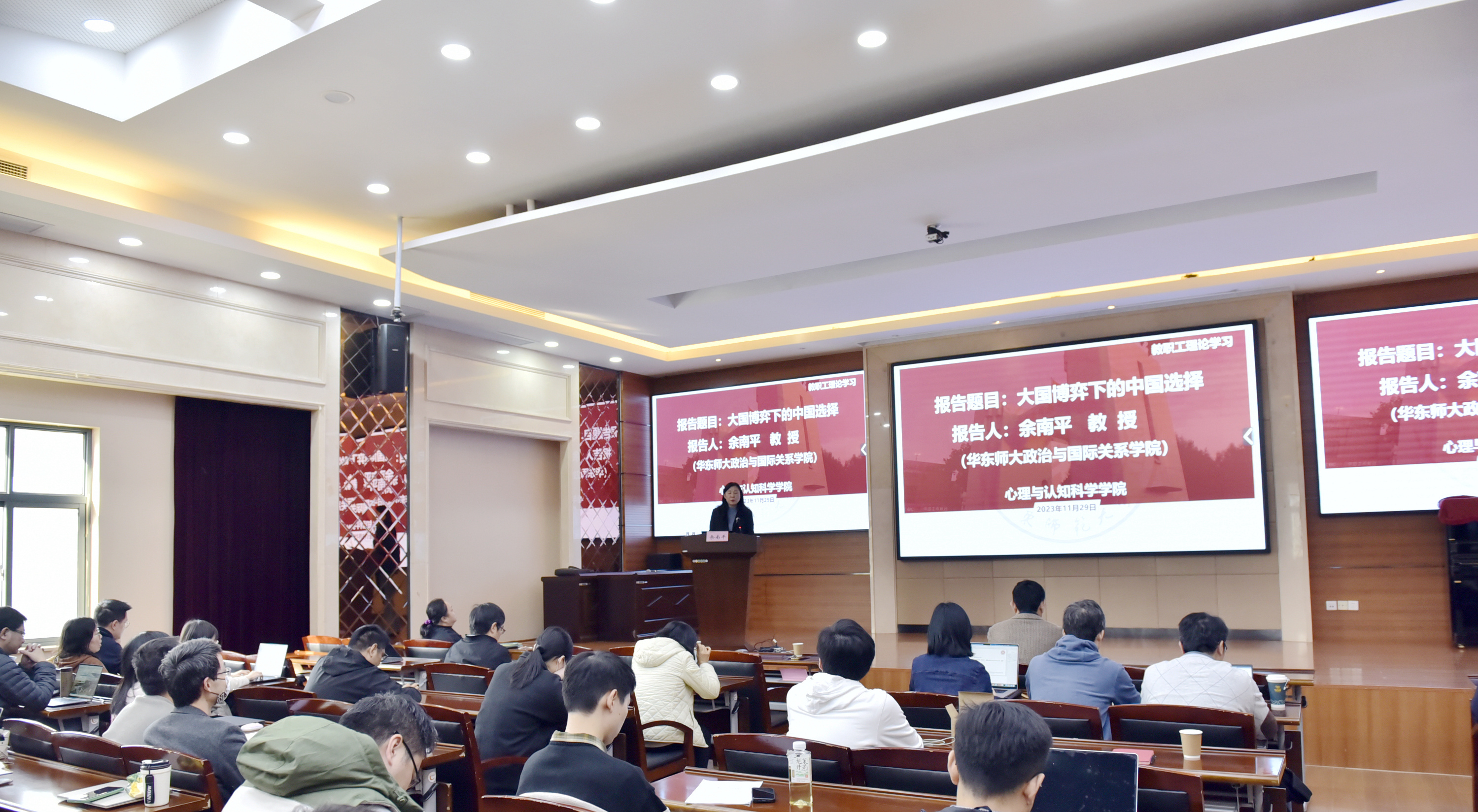 近年来,国际局势急剧变化,中美博弈、俄乌冲突、巴以纷争不断上演,一方面和平发展、合作共赢的历史潮流不可阻挡;另一方面恃强凌弱、巧取豪夺、零和博弈等霸权霸道霸凌行径危害深重,人类社会面临着前所未有的挑战,世界又一次站在了历史的十字路口,何去何从取决于各国人民的选择。为使我院教职工在百年未有之大变局的背景下,更好地理解我国的对外政策,2023年11月29日下午,我院邀请华东师范大学政治与国际关系学院余南平教授,做了题为“大国博弈下的中国选择”的专题报告。报告会由院党委书记方媛主持。