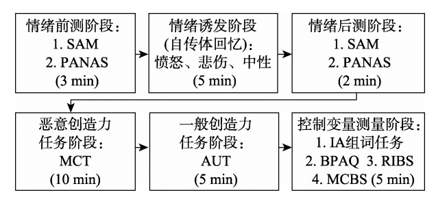 实验1招募了102名大学生受试者,将受试者随机分入愤怒情绪、悲伤情绪和中性情绪组。性别比例在3组之间平衡(每组女性均为28人,男性均为6人)。愤怒组和悲伤组受试者通过完成时长5分钟的自传体回忆任务分别诱发愤怒情绪和悲伤情绪,而中性情绪组受试者需要完成1个耗时5分钟的对照任务(即详细记录一天的日程)。此外,受试者需要完成情绪状态前后测(Self-Assessment Manikin, SAM,SAM和Positive and Negative Affect Schedule,PANAS)、内隐攻击性水平测量(任务为偏好组词任务)、恶意创造力任务(malevolent creativity task,MCT)、一般创造力任务(alternative uses task,AUT)和一系列控制变量的量表(详情见图1)。这些量表如下:使用Buss-Perry攻击性量表(Buss-Perry Aggression Questionnaire, BPAQ)评估个体日常状态下的攻击性;使用创造力行为量表(Runco Ideational Behavior Scale, RIBS)评估个体在日常生活中的创造性行为倾向;使用恶意创造力行为量表(Malevolent Creativity Behavior Scale, MCBS)评估个体的恶意创造性行为倾向。
