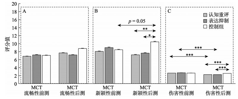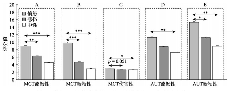 图2. 实验1不同情绪条件下的恶意创造力和一般创造力表现