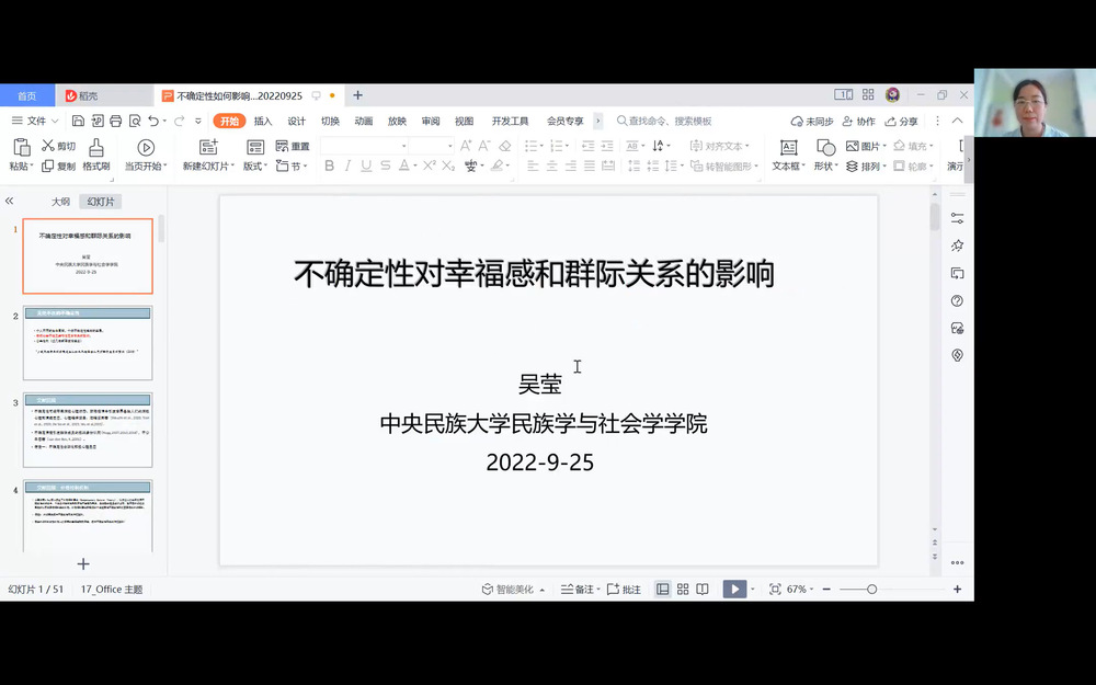 中央民族大学吴莹副教授以“不确定性对幸福感和群际关系的影响”为题作特邀报告。她在多项研究成果中揭示了不确定性对个人发展、社会结构、公共事件的影响,指出不确定性会降低人的控制感和幸福感,加剧人感知到的群际冲突,而较高的文化规范知觉则对不确定性的负面影响起到缓冲作用。她表示,应当充分发挥外在社会系统的积极调控功能,以积极的态度应对不确定性,发现不确定性的积极面。