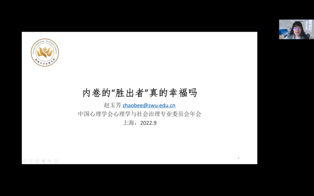 西南大学赵玉芳教授以“内卷‘胜出者’真的幸福吗”为题作特邀报告。她从内卷的社会现实切入,揭示了社会阶层和群际态度、幸福感之间的关系。她表示,低地位群体对自身群体抱有负面态度,这反而不利于其心理健康。而高社会阶层通常幸福感更高,但也受困于“内卷”心态,若其持有较强的自我增强价值观,则幸福感降低。她指出,心理学还需要为加入常态性社会心理建设继续努力。