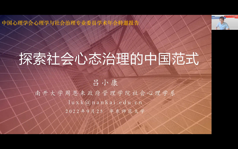 党的十八大以来,国家高度重视社会治理问题,大力加强和创新社会治理、健全社会心理服务体系建设。面临新冠疫情持续和全球政治经济形势变化的新挑战,社会治理离不开心理学的智力支持和科学贡献。为回应时代问题,助力国家更好进行社会治理,2022年9月23-25日,在华东师范大学普陀校区,召开了“中国心理学会心理学与社会治理专业委员会第三届学术年会”。本次会议以“不确定时代的社会心态:挑战与应对”为主题,由中国心理学会心理学与社会治理专业委员会、华东师范大学心理与认知科学学院、上海市心理学会主办,上海市心理健康与危机干预重点实验室、上海市脑功能基因组学重点实验室协办。来自国内高校和科研机构的350余位学者,通过线上线下结合方式参加了本次会议。