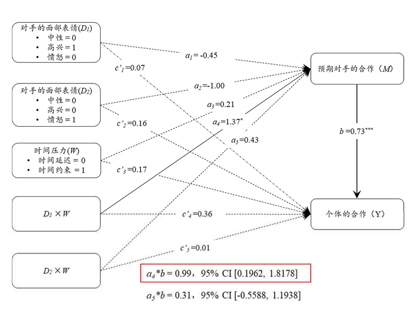 为了考察当事人的决策模式或信息加工方式是否会调节偶然性情绪信息的作用,在实验2和3中,分别采用指导语和时间压力操纵决策模式, 以反复考察何种决策模式下人们更容易受对手偶然性情绪信息的影响。两个实验一致表明,直觉决策模式下,偶然性情绪信息对对手合作预期及行为的影响更强、更大。具体而言,在实验2中, 在直觉决策模式下, 高兴和中性表情组的合作水平显著高于愤怒面部表情组的合作水平, 被试预期高兴和中性表情对手的合作水平显著高于愤怒面部表情对手的合作水平, 且仅在直觉决策模式条件下, 被试对对手合作行为的预期中介了愤怒表情(vs. 中性表情)对个体合作行为的作用。在实验3中, 在时间约束条件下, 高兴面部表情组的合作水平显著高于中性和愤怒面部表情组的合作水平, 被试预期高兴面部表情对手的合作水平显著高于中性和愤怒面部表情对手的合作水平, 且仅在时间约束条件下, 被试对对手合作的预期中介了高兴面部表情(vs. 中性表情)对个体合作行为的效应(参见图4、5、7、8)。