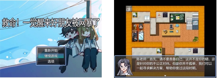 项目介绍:随着互联网技术的发展,网络欺凌正在变得更加普遍。研究表明,网络欺凌与压力、抑郁等有关,甚至会导致自杀行为的产生。而青少年正处于心理发展的特殊时期,因此更容易受到网络欺凌的负面影响。基于此,项目成员以21世纪的当下为背景,设计了一款剧情类角色扮演游戏,让青少年扮演一名朋友遭遇到网络欺凌的青少年,通过陪伴朋友一起解决网络欺凌的过程,了解到网络欺凌行为的定义、不同形式以及如何应对网络欺凌,达到寓教于乐的目的。此外,项目组成员还在席居哲老师的指导下,发挥心理学专业特长,在游戏中向玩家介绍了一系列情绪放松技巧,通过游戏的形式对玩家进行了心理健康科普,获得了评审老师的好评。
