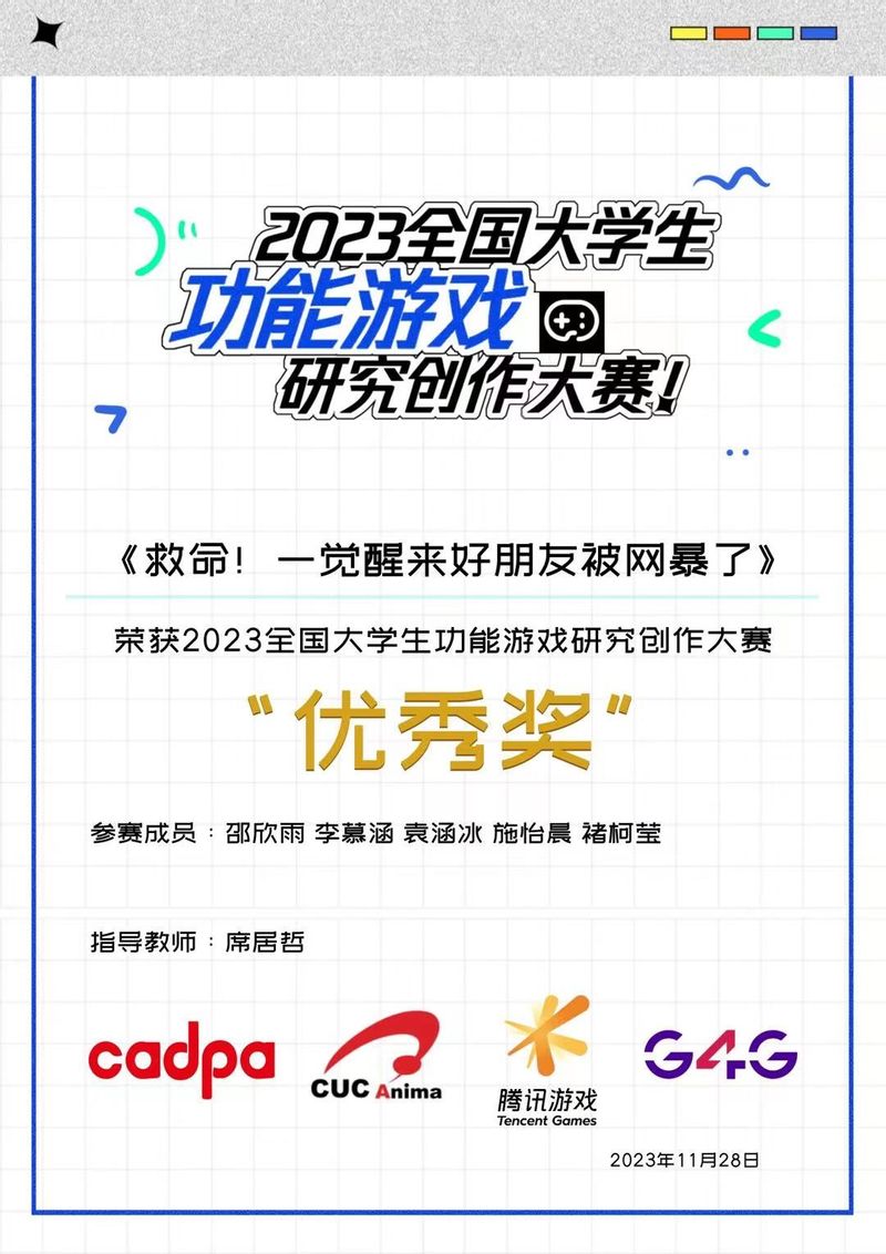 我院学子积极报名参赛。经过激烈角逐,本科生团队以青少年网络安全教育为主题创作的游戏《救命!一觉醒来好朋友被网暴了》在比赛中脱颖而出,获得优秀奖的好成绩。