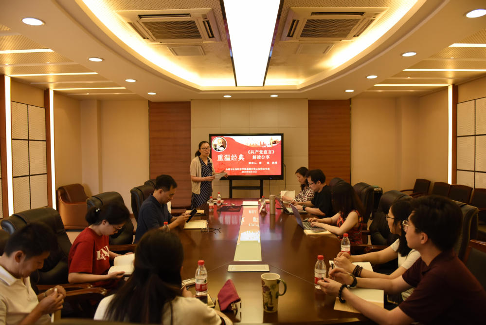 为庆祝建国70周年、建党98周年,贯彻习总书记“读原著、学原文、悟原理”的重要指示,进一步深入开展“不忘初心、牢记使命,贯彻落实党的十九大精神”学习实践活动,6月19日,心理与认知科学学院基础行政认知联合教工党支部举办了重温经典—--《共产党宣言》解读分享活动。