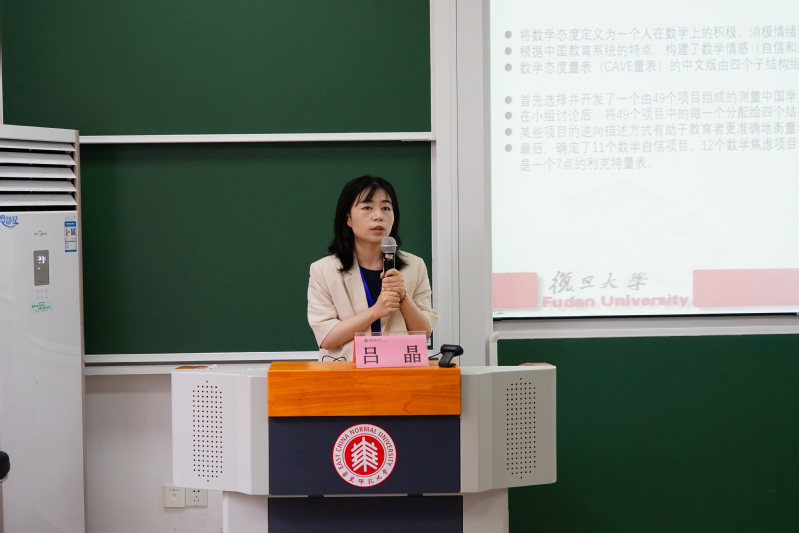 复旦大学青年副研究员吕晶在报告中关注数学态度与学习STEM专业关系。她首先介绍了本土化数学态度量表(CAVE量表)的编制和修订过程;关于数学成绩对数学态度和STEM专业学习的影响,她认为主要表现在数学态度影响攻读专业,另外除了价值和享受,数学成绩起到了中介作用。