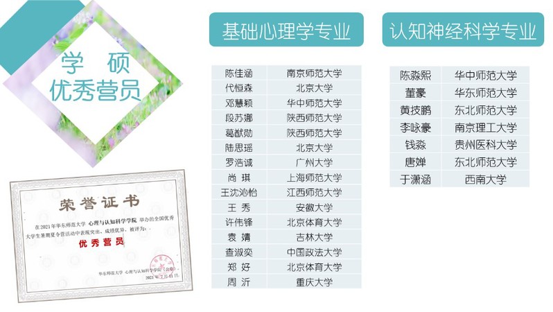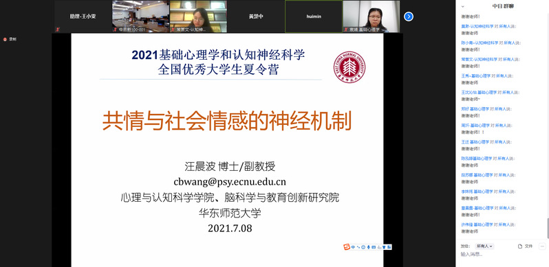 本次夏令营虽以线上会议形式进行,但依然让全国各地的优秀大学生感受到华东师大心理与认知科学学院的良好科研条件和浓厚的学术氛围,也为营员们提供了与导师密切交流学习的机会。希望更多的有志于从事基础心理学、认知神经科学及应用心理研究工作的优秀大学生来心理与认知科学学院继续深造,为推进心理学、脑科学及应用心理的研究及发展贡献力量。