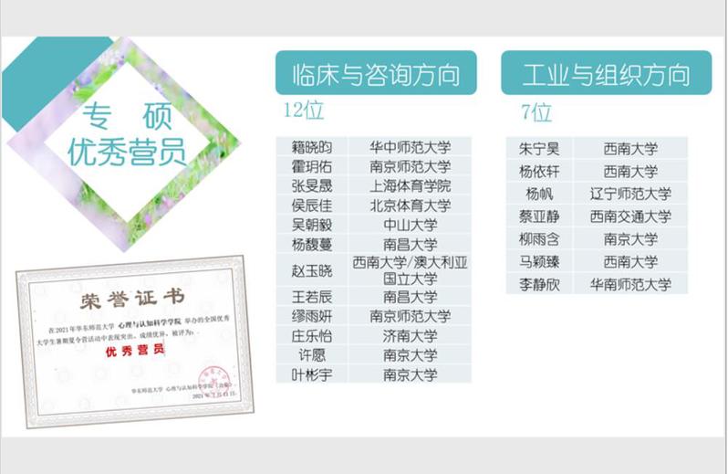 面试考核结束后,应用心理19位同学被评选为优秀营员,其中12位为临床与咨询心理学方向,7位为工业与组织心理学方向。。