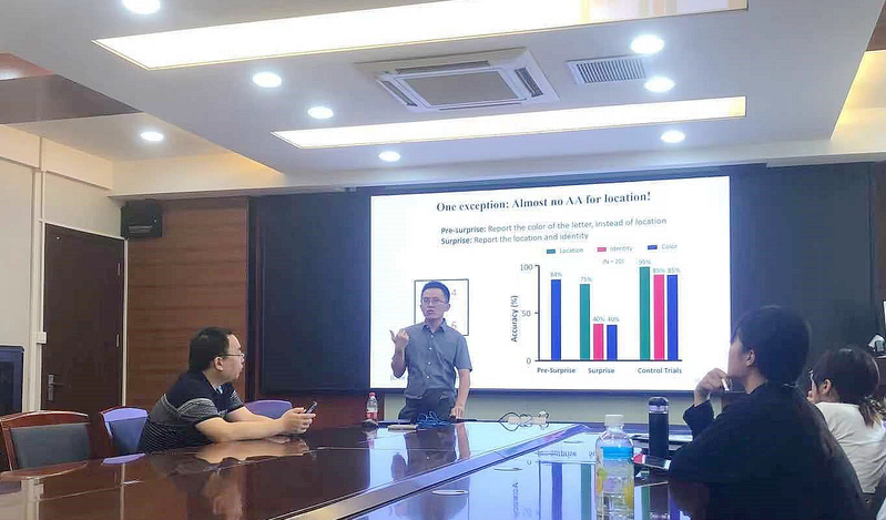 在报告中,陈辉介绍了其发现的属性失忆现象(Attribute Amnesia, abbr. AA),并阐述了对于AA现象的一系列深入研究,包括对可能影响AA现象的相关因素的研究,以及对其内在机制的探索。其中陈辉着重探讨了“主动遗忘”与“加工冲突”作为AA现象内在机制的可能性,并报告了其团队在此领域的最新研究成果,包括一系列行为研究、眼动研究、及电生理研究。最后,陈辉介绍了如何其他认知心理学实验中,使用AA现象来作为实验操作手段,并介绍一些相关成果。通过陈辉的介绍,与会师生对于注意与工作记忆的前沿研究方向有了更深入的认识。