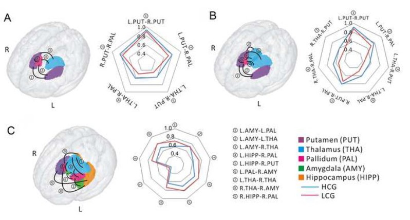 结果发现,双侧壳核、右侧苍白球与双侧壳核、左侧丘脑与右侧壳核/苍白球之间的功能连接显示出显著的组间差异。动态功能连接变异性的结果发现,HCG和LCG在壳核、丘脑、苍白球、杏仁核和海马之间存在显著差异,且HCG的皮下网络变异性指标更小,说明HCG的皮下网络稳定性更高(见图2)。 图论结果也发现,HCG比LCG的皮下网络的信息传递效率更高(见图3),这表明高水平组的皮下网络比低水平组的网络效率更优化。